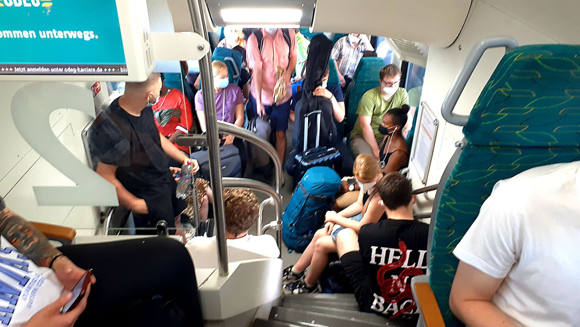 Der Getränkeautomat am Bahnsteig ist kaputtgegangen und so laufe ich noch schnell nach unten ins Bahnhofsgebäude und erstehe an einer Bäckerei eine leicht gekühlte Apfelschorle. Kurz vor unserem Zug hält ein IC nach Hamburg, der voller Menschen ist und uns schwant Übles. Als dann aber danach unser Regionalzug kommt, ist fast niemand drin – und wir fahren zwar ohne Strom und WLAN, aber entspannt nach Hamburg.