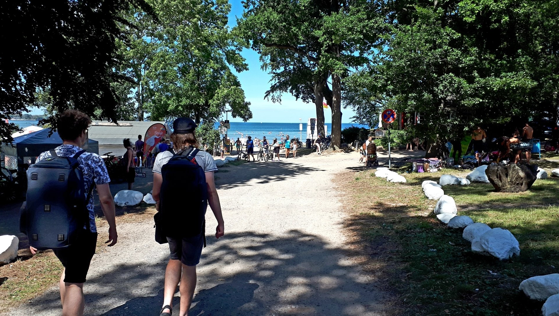 Die Fahrt dauert drei Stunden, allerdings hat der Zug jetzt soviel Verspätung, dass wir unseren Bus nach Poel zwar noch vorbeifahren sehen – das war's dann aber auch schon. Der nächste geht laut Fahrplan erst in zwei Stunden, aber das würde unsere Reisepläne über den Haufen werfen. Tante Google empfiehlt einen anderen Ort: in Zierow – nie gehört – soll es auch einen schönen Badestrand geben. Und in fünf Minuten fährt ein Bus dort hin ab. Wir fackeln nicht lange und fahren mit dem Bus ins Unbekannte. Und zum ersten Mal will der Busfahrer tatsächlich die Tickets sehen! Mein Ältester muss erst ein bisschen danach kramen, aber dann ist alles gut und eine halbe Stunde später sind wir da. Kleine Ferienhäuser, zum Teil im schwedischen Stil, markieren die Küstennähe. Wo ist denn jetzt der Strand? Wir gehen in Richtung eines ausgeschilderten Campingplatzes – und plötzlich sehen wir dann das Meer, diese endlose blaue Linie, die mit dem Horizont zusammen trifft. Da geht mir als Binnenländer jedesmal das Herz auf.