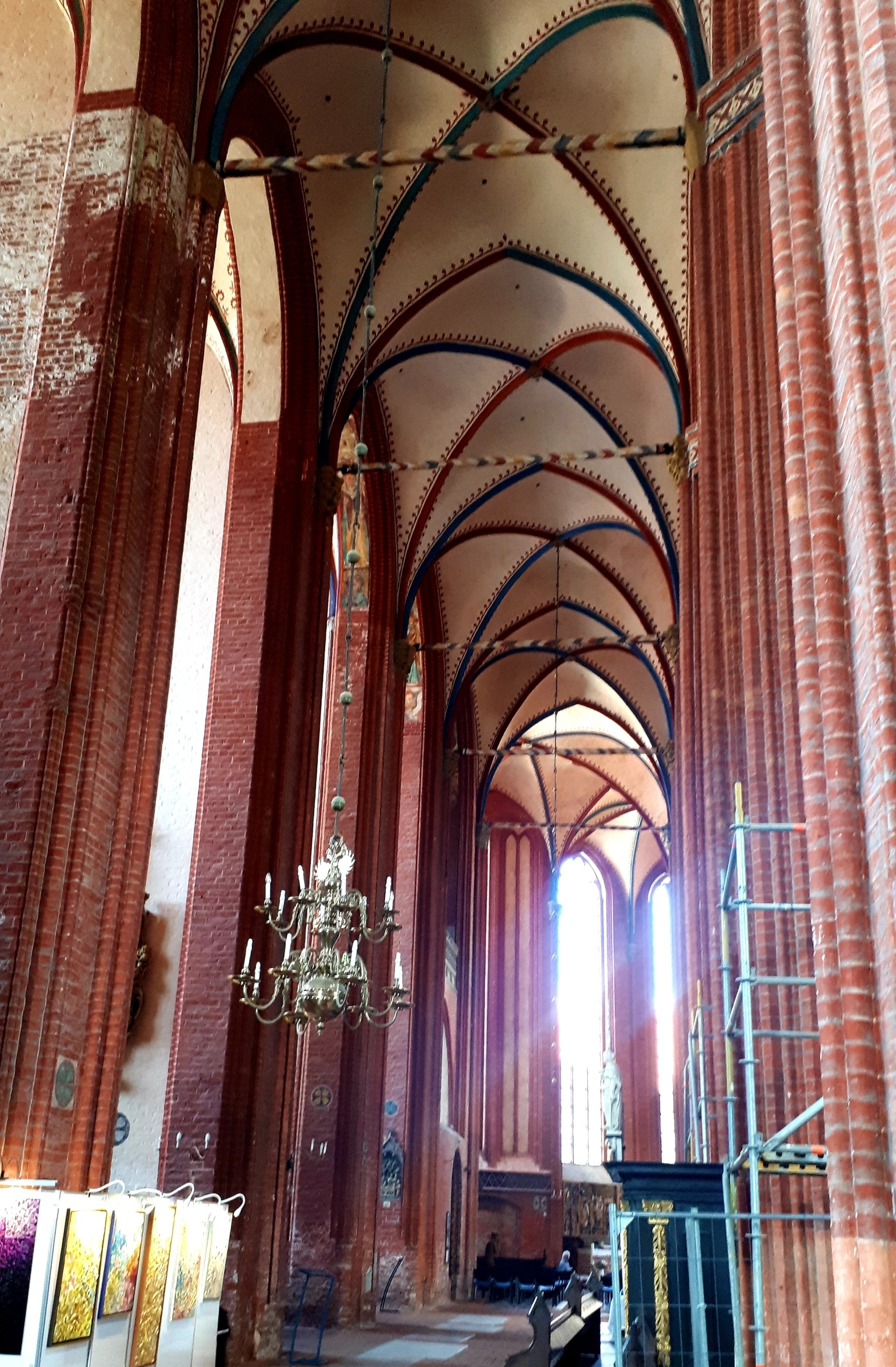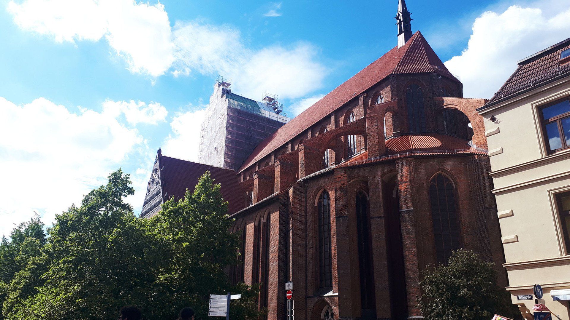 Ein schöner, feiner Sandstrand liegt vor uns, gut mit Sonnenhungrigen bevölkert. Ein Stück weiter links gibt es noch einen freien Platz. Wir haben die Sandalen ausgezogen, weil ja doch nur Sand hineinkommt. Aber der Sand ist glühend heiß und so gehen wir an der Wasserlinie entlang. Nach kurzer Zeit merken wir: so geht das nicht. Die anderen Badegäste haben sich Sonnenschirme aufgestellt oder ihren aufstellbaren Windschutz zum Sonnenschutz umfunktioniert; wir haben nichts dergleichen und so ziehen wir uns etwas weiter vom Strand über scharfkantiges Gras in den Schatten einiger Bäume zurück, um hier nicht gegrillt zu werden. Alicante ist nichts dagegen! Wir baden abwechselnd im Meer, das hier sehr lange flach ist, so dass man schon weit raus muss, um schwimmen zu können. In Strandnähe fühlt sich das Wasser an wie in der Badewanne, aber weiter draußen ist es angenehm kühl. Wir betrachten das muntere Treiben am Strand – wunderbar, ein richtiges Urlaubsgefühl stellt sich ein! Nur die Schlange am Eisstand ist einfach zu lang. Wir verbringen hier gut zweieinhalb Stunden, dann packen wir zusammen, streifen den Sand von den Beine und nehmen den Bus zurück nach Wismar. Wir nutzen den Aufenthalt, um das kleine Städtchen mit seinen bunten Häusern noch ein bisschen anzusehen. Eine beeindruckende Backsteinkirche – in der es herrlich kühl ist – findet unsere Aufmerksamkeit. Meine linke Hacke tut ein bisschen weh, ich werde wohl morgen mal von den neuen Sandalen auf Schuhe umsteigen.
