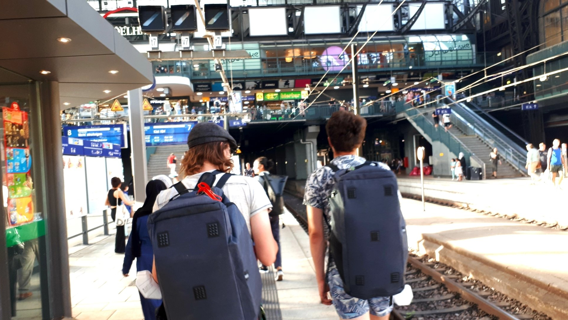 Das kleine Regionalbähnchen ist schön leer und bietet ein bisschen mehr Beinfreiheit. Wir fahren durch Bad Kleinen, wo 1993 die versuchte Festnahme von RAF-Terroristen in einem Desaster endete, und kommen schließlich in Schwerin an. Das Warten auf den Zug, der uns nach Hamburg bringen soll, beherrschen wir inzwischen perfekt: ständig die Anzeigen am Bahnhof kontrollieren, gleichzeitig auf der DB-App nach Gleisänderungen schauen, versuchen, das Gebrabbel der Ansagen zu verstehen – und wenn der Zug kommt, schnell taxieren, ob er da hält, wo wir stehen – und bei Bedarf losrennen.