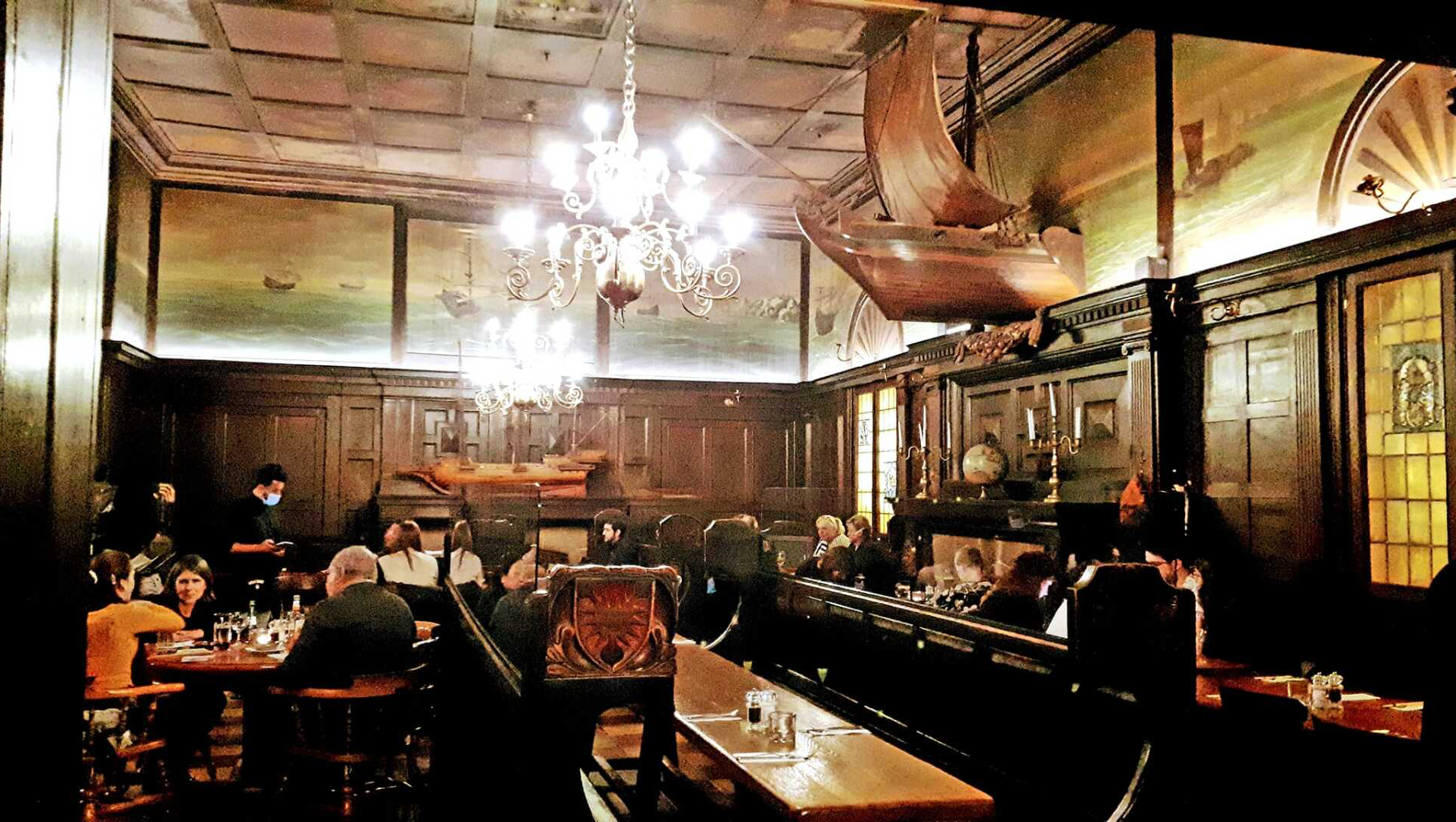 Als wir die herrlich kühlen Hotelzimmer betreten – heute sind es mal zwei, weil kein Dreibettzimmer zu kriegen war – ist es unser erster Impuls, uns auf den Betten auszustrecken und den Rest der Woche einfach nur in dieser kühlen Brise zu liegen und keinen Finger mehr zu rühren. Dann aber kehren unsere Lebensgeister zurück und wir fahren wieder in die City – hurra, um die Ecke fährt ein Bus – wo wir erst in einem Fischrestaurant essen (schließlich sind wir unter Hanseaten). Allerdings gibt es die leckeren Süßkartoffel-Knoblauch-Pommes nicht mehr, die mein Jüngster bei einem früheren Besuch hier schätzen gelernt hat. Schade – das Essen ist aber ganz manierlich und vor allem ist der Raum stilvoll mit lauter alten Schiffsteilen und Schiffmodellen ausgestaltet, sogar ein Tiefseetaucherhelm ist dabei. Die hohen Decken mit den Holzbalken sind mit maritimen Motiven bemalt und wir sitzen auf alten, dunklen Holzbänken mit hohen Lehnen. Merke: Radler heißt in Hamburg „Alsterwasser“ und wenn man nach einem anstrengenden und heißen Tag eines bestellt, „verdunstet“ es auf der Stelle.