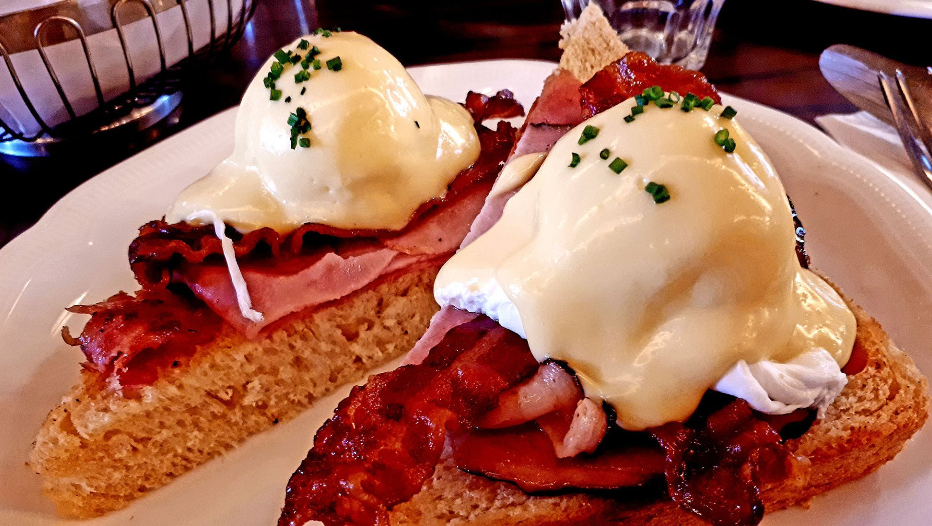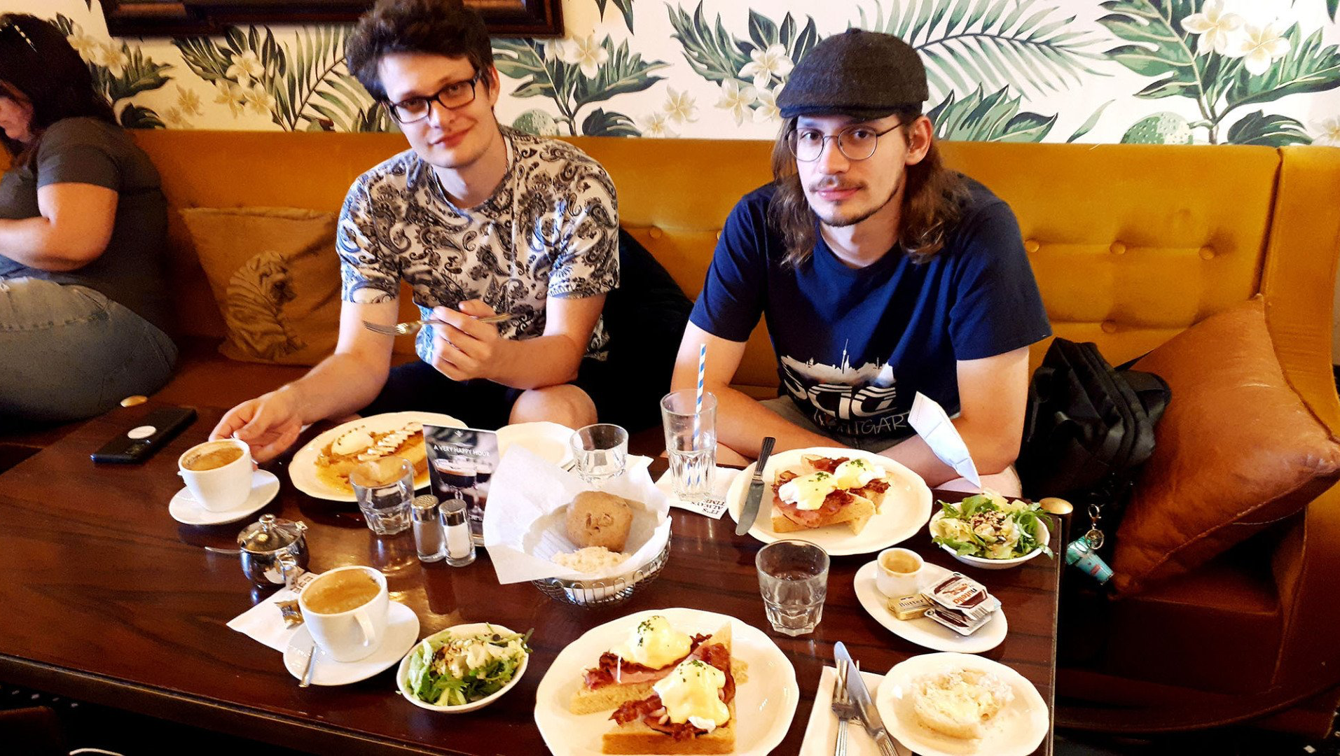 Wir haben bewusst kein Hotelfrühstück gewählt, denn heute will ich den Jungs den ultimativen Ort für gutes Frühstück zeigen: die Berliner Dependance des berühmten „Benedict“ aus Tel Aviv. Eigentlich bin ich es gewohnt, davor Schlange zu stehen, doch heute ist ein Tisch im Frühstückstempel frei und wir können uns direkt in den angenehm kühlen Raum setzen. Tapeten mit Blättermotiven und exotischen Vögeln, Propellerventilatoren an der Decke, gediegene, entspannte Wohnzimmeratmosphäre und ein wirklich wahnsinnig netter Service. Und dann die pochierten Eggs Benedict, serviert mit Sauce Hollandaise auf Toast mit Schinken und knusprigem, frischgebackenem Bacon, die hausgemachte Apfel-Zimt-Marmelade, der Korb mit frischen Brötchen, der immer wieder aufgefüllt wird und das wunderbare French Toast, das mein Ältester genießt – was red' ich: das muss man einfach selbst erleben. Heute geht's uns gut!