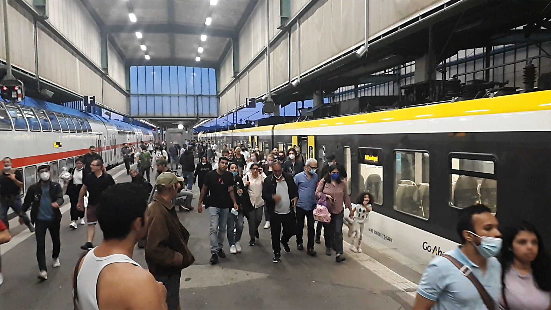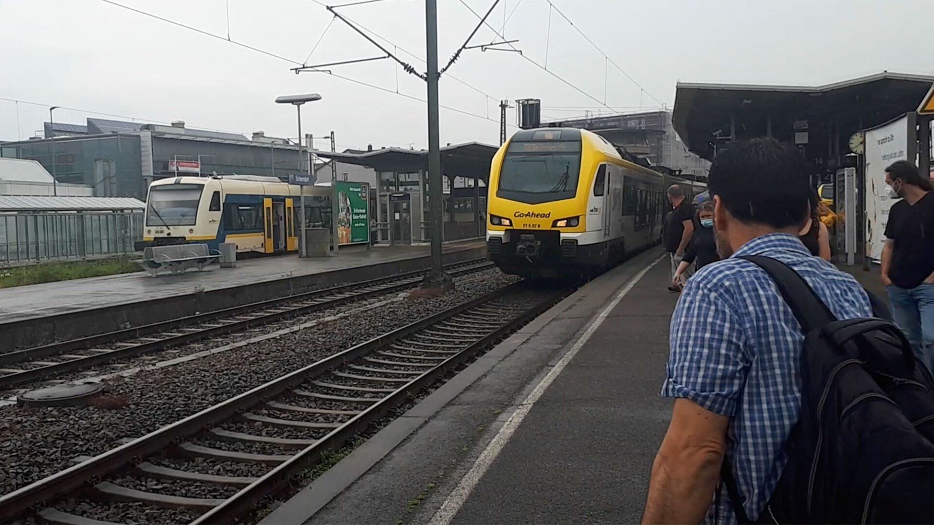 Unser Plan ist es, so rechtzeitig am Gleis zu sein, dass wir möglichst noch Sitzplätze finden, bevor es zu voll wird. Unser Zug soll eigentlich um 20.05 aus Gleis 13 fahren, aber die Bahn-App und die Anzeigen vor Ort informieren uns, dass wir heute auf Gleis 10 müssen. Am Bahnsteig sitzen schon einige CSD-Besucher, die man an ihren bunten Fahnen erkennen kann. Wir stehen in einem großen Durchgangsbahnhof, befremdlicherweise sehen wir aber auch eine Straßenbahn, die auf einem der Gleise steht. Die Anzeige an unserem Bahnsteig ist etwas verwirrend. Der IRE aus Stuttgart kommt um 19.53 an - allerdings soll man in diesen nicht einsteigen, angeblich endet der Zug hier. Eigenartig. Wird der Zug ausgetauscht? Schaffen die das in 12 Minuten? Oder läuft irgendeiner durch den Zug, checkt alles - und dann wechselt doch die Anzeige?