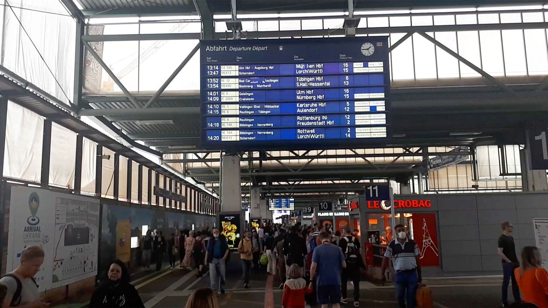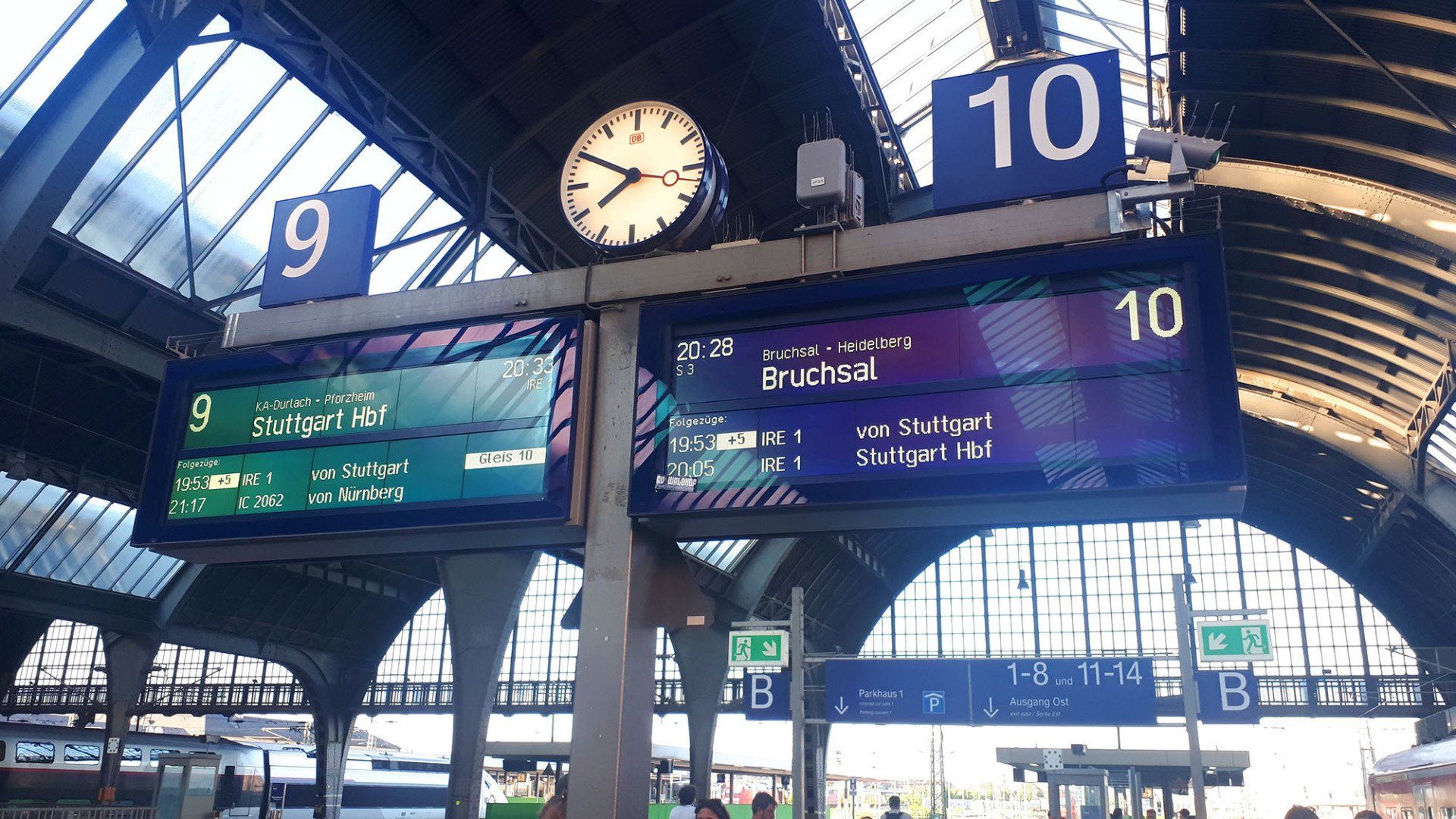 Von Gleis 13 hören wir eine Ansage: unser Zug würde heute von Gleis 10 fahren. Wissen wir. Aber nun wälzt sich von Gleis 13 eine Volksmenge die Treppen hinauf, die offenbar auch nach Stuttgart will - auweh, jetzt wird’s eng. Die Anzeige auf Gleis 9 kündigt jetzt den nächsten IRE nach Stuttgart an, der um 20.33 Uhr fahren soll. In diesem Moment wechselt die Anzeige an unserem Gleis. In groß wird jetzt eine Bahn nach Bruchsal angekündigt, die um 20.28 fahren soll, unser Zug steht darunter unter „Folgezüge“, immer noch mit der Abfahrtszeit 20.05. What? Hier kann etwas nicht stimmen. Dafür wird der der Zug aus Stuttgart jetzt mit 5 Minuten Verspätung ankommen. Und in diese Moment ist eine Durchsage zu hören. Der Zug aus Stuttgart - so sagt man uns - wird auf Gleis 13 einfahren, nicht hier. Alle sehen sich groß an. Dort steht immer noch, dass unser Zug von Gleis 10 abfahren soll, aber kann das sein, wenn er auf Gleis 13 einfährt? Haben die das nicht aktualisiert oder sind es doch zwei verschiedene Züge?