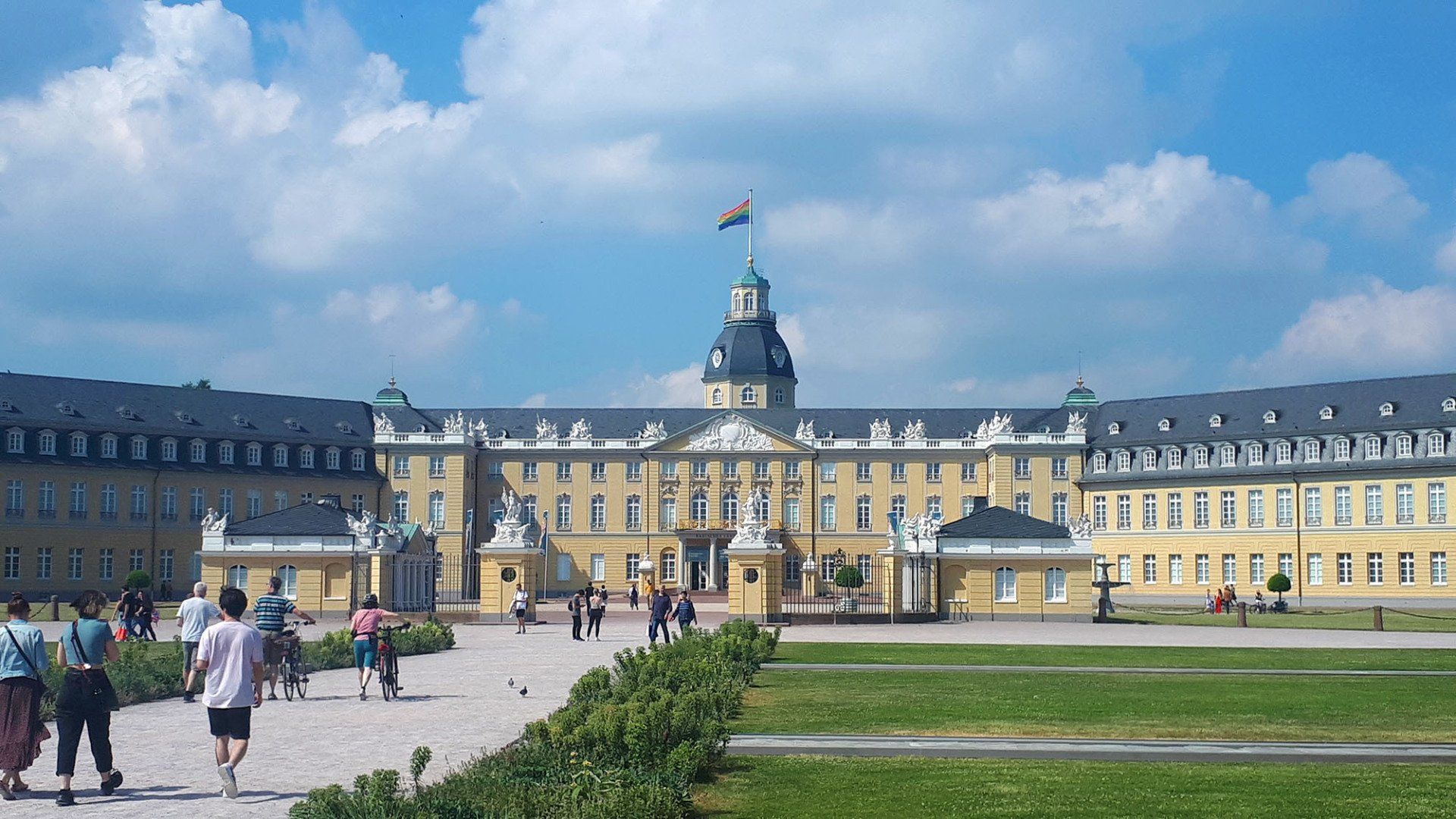 Wir gehen zum Schloss, mein Sohn trifft einen alten Schulfreund, der in Karlsruhe studiert und den er spontan verständigt hat, wir gehen zusammen Essen und es ist immer noch genug Zeit, um durch die Innenstadt zu bummeln und an der CSD-Bühne noch ein bisschen mitzufeiern. Hat es bei der Abfahrt zuhause noch geregnet, ist das Wetter jetzt fantastisch und wir genießen den Tag. Den Rückweg zum Bahnhof gehen wir zu Fuß, immer am Stadtgarten entlang. Von einer Fußgängerbrücke aus bekommen wir vom Zoo noch einen Elefanten und ein paar Pfauen zu sehen. Ein Pfau ist komplett weiß und rennt über die Wiese - er sieht aus wie eine Braut auf der Flucht, die eine weiße Schleppe hinter sich her zieht.