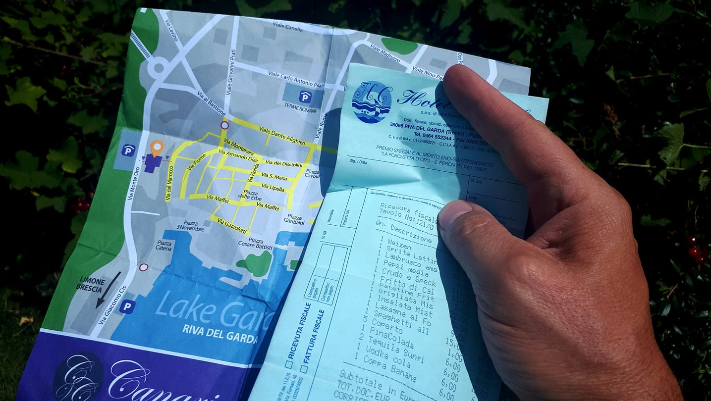 Nun ist alles dicht, die Rollläden sind geschlossen und alle Schirme sind aufgespannt, damit die Sonne die Räume nicht noch mehr aufheizen kann. Kräftige Windstöße zerren an den Schirmen und immer mal wieder muss einer raus in den Glutofen, um alles wieder zu richten. Ich habe nun vertäut was zu vertäuen war. In der Außentasche meiner Sommerhose hat Papier geraschelt und ich habe einen Stadtplan von Riva am Gardasee gefunden und die Rechnung für ein opulentes Abendessen mit der ganzen Familie, August 2019.