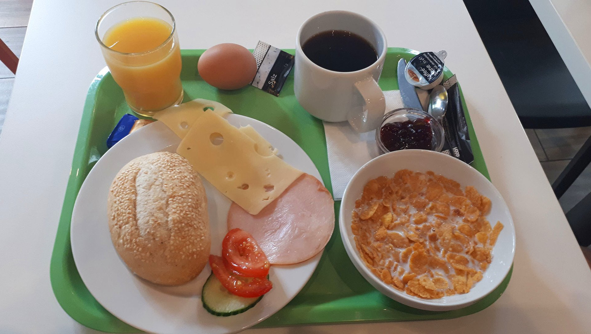 Das Budget-Hotel in Leipzig hat sich als Glücksgriff erwiesen. Das Zimmer mit Stockbett ist klein und schlicht, aber es gibt eine eigene Nasszelle und vor allem ist es klimatisiert. Außerdem ist das Frühstück sehr anständig und so ziehen wir gestärkt los.