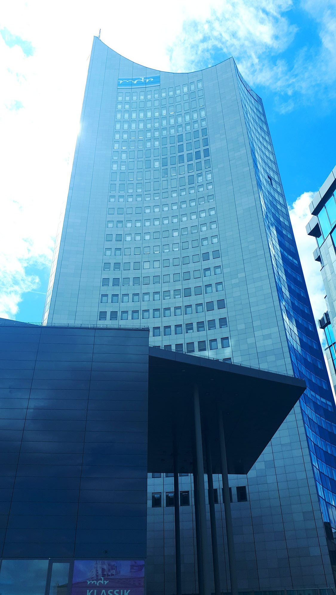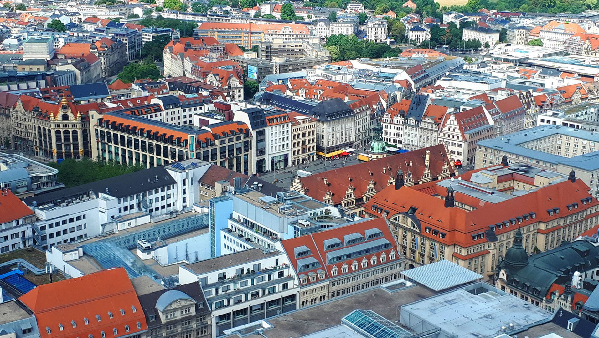 Die Jungs sehen den Turm des „City-Hochhauses“ mit der schrägen Spitze, der die ganze Stadt überragt und beschließen: da müssen wir rauf. Tatsächlich führt ein Aufzug bis oben und für ein paar Euros darf man bis aufs Dach klettern. Mit 130 Metern ist das der höchste Aussichtspunkt Mitteldeutschlands (und für eine Zeit war es sogar mal das höchste Gebäude Gesamtdeutschlands). Der Ausblick auf die Stadt und das Umland ist wirklich atemberaubend, das hat sich gelohnt.