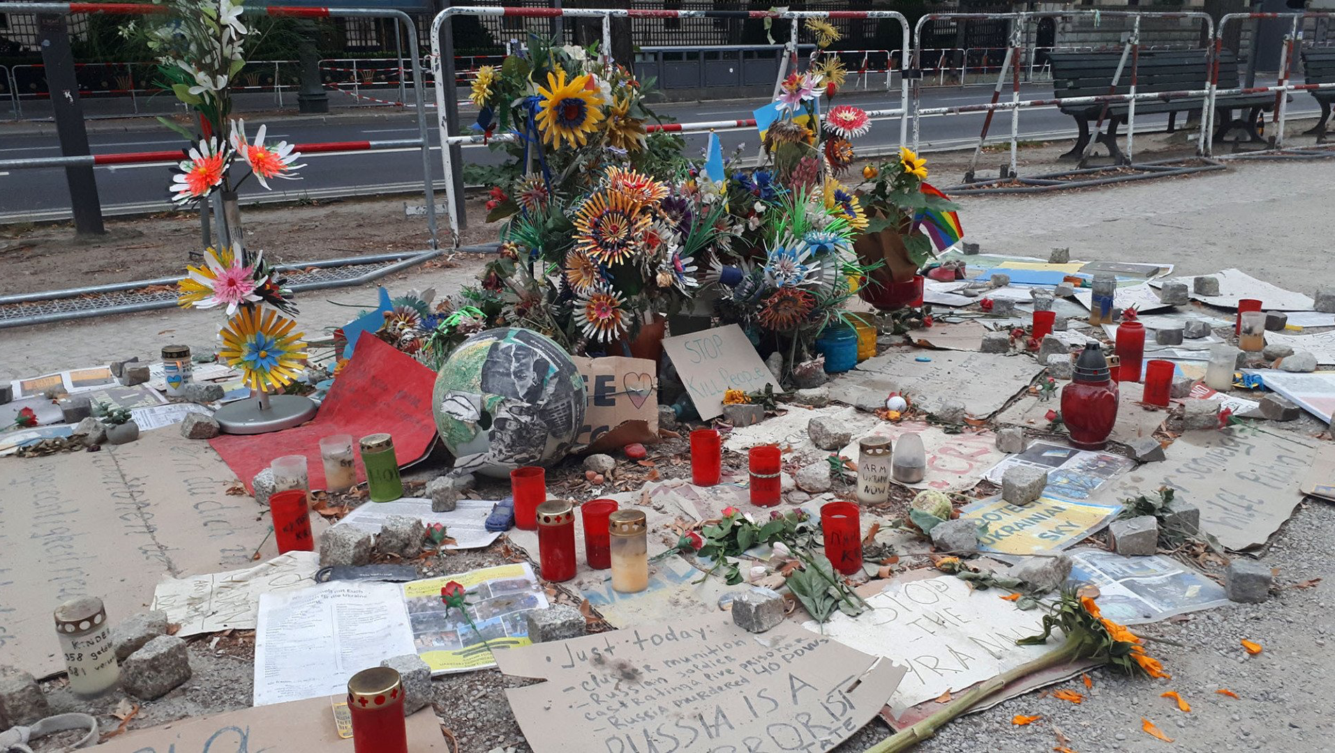Wir nehmen die neue U-Bahn vom Bundestag zurück hinter das Brandenburger Tor, um nicht noch einmal durch das fleischgewordene Narrenschiff gehen zu müssen. Die Dämmerung setzt ein und wir gehen „Unter den Linden“ entlang bis hinüber zum Alexanderplatz. Ich genieße immer noch das Gefühl, hier einfach so frei und unbeschwert und ohne jede Kontrolle gehen zu können – das werde ich den Kindern wohl nicht vermitteln können. Vor der Russischen Botschaft, die noch das alte Sowjetwappen trägt – jetzt kann man's ja vielleicht gleich dranlassen – ist eine kleine Gedenkstätte mit Blumen, Bildern, Texten und ukrainischen Fahnen aufgebaut worden, die der Opfer des russischen Kriegsverbrechens gedenkt.